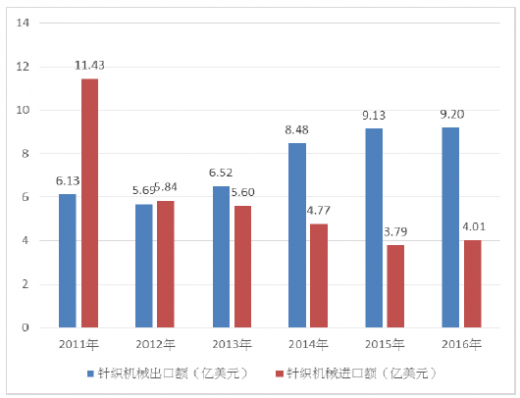 在针织机械领域,我国自2013年开始已逐步实现进口替代。据统计,2016年我国针织机械出口额为9.20亿美元,同比增长0.77%;进口额4.01亿美元,同比增长5.81%,针织机械出口额已大幅超过进口额。