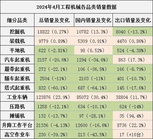 1.总销量增幅变化上,挖掘机、装载机、平地机、汽车起重机、随车起重机、工业车辆、升降工作平台这7大品类4月表现优于3月,或降幅收缩、增幅提升,或由负转正;