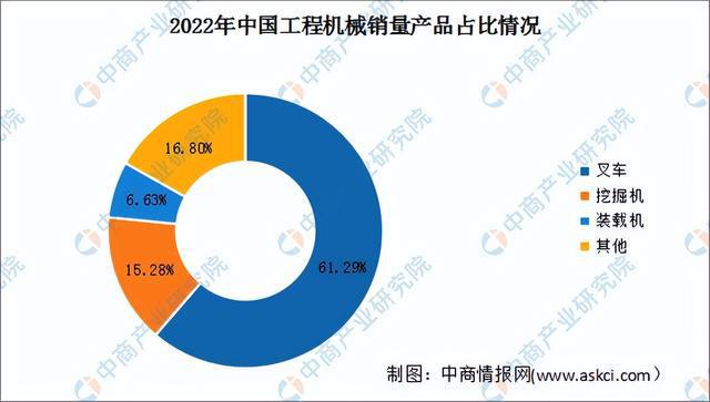 目前,工程机械主要产品包括挖掘机、装载机、起重机、压路机、推土机、平地机、摊铺机等。2022年,叉车销量占我国主要工程机械产品销量的61.29%,占比第一;其次是挖掘机,占比为15.28%;装载机排名第三,占比达6.63%。