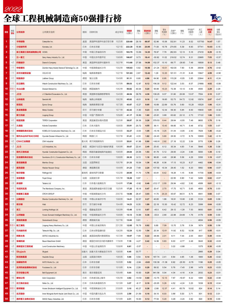 “2022年全球工程机械制造商50强”中,有12家中国制造商入榜,总销售额达578.81亿美元,占总榜份额26.15%,继续保持全球第一;排名第二的是美国,总销售额为532.08亿美元,占总榜份额24.03%;日本企业销售额为455.15亿美元,占比为20.56%,米乐 m6中国官方网站排名第三。在大会发布的多份细分榜单上,中国制造商的整体规模、业务水平等同样居于领先。